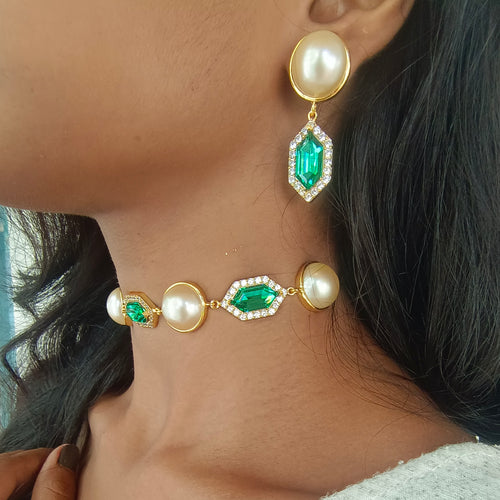 A collection of occassion wear pieces set with exquisite jewel tones Swarovski crystals in hues of emerald, sapphire and amethyst, offset by luxe cream - gold Swarovski pearls. Handcrafted to perfection, 22kt gold polished
