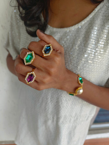A collection of occassion wear pieces set with exquisite jewel tones Swarovski crystals in hues of emerald, sapphire and amethyst, offset by luxe cream - gold Swarovski pearls. Handcrafted to perfection, 22kt gold polished